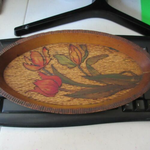 Pyrography Burnt Wood Red Flowered Oval Tray