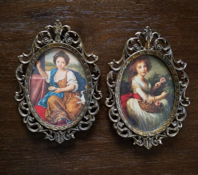 2 Vintage Oval Ornate Metal brass Picture Frame Made in Italy 7" tall w/glass