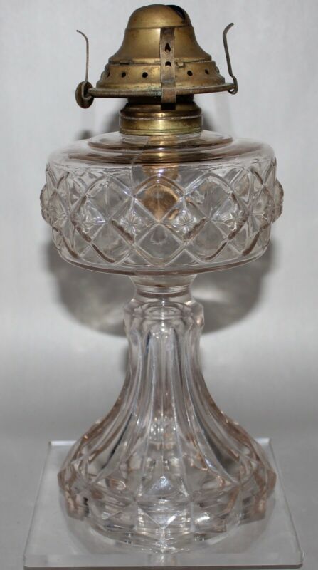 ANTIQUE Pedestal Oil Lamp STAR & DIAMOND Glass EAPG
