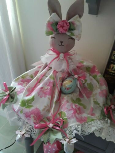 Title (ebay affiliate link): SHABBY PINK ROSES SPRING EASTER DRESSED LADY BUNNY RABBIT w/ EASTER Egg