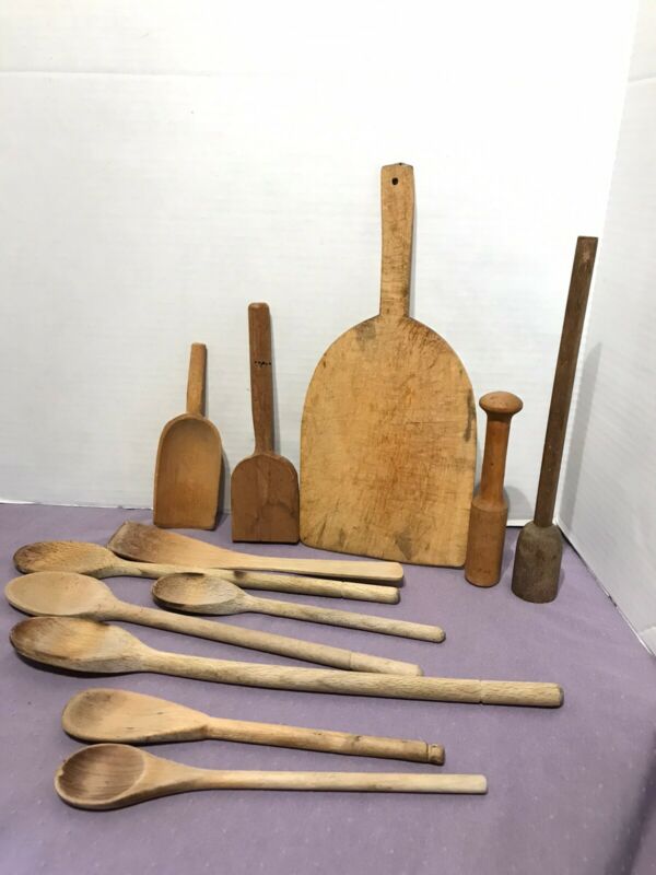 Title (ebay affiliate link): 12 Pc Old Primitive Wood Kitchen Utensils Masher Butter Paddle Spoons Decor/ Use