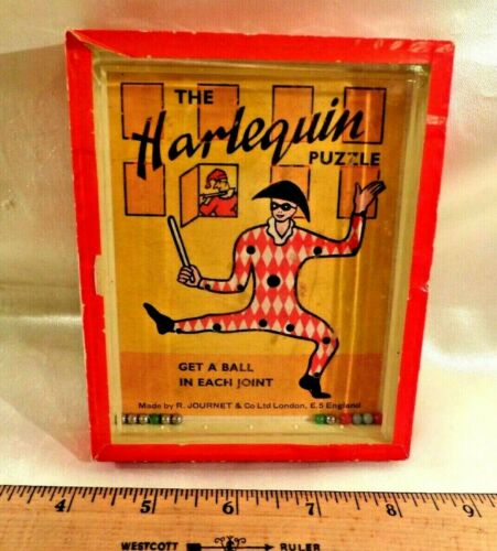 Title (ebay affiliate link): VINTAGE TOY HARLEQUIN PUZZLE, BOX HAS TINY STEEL BALLS THAT ROLL INTO HOLES