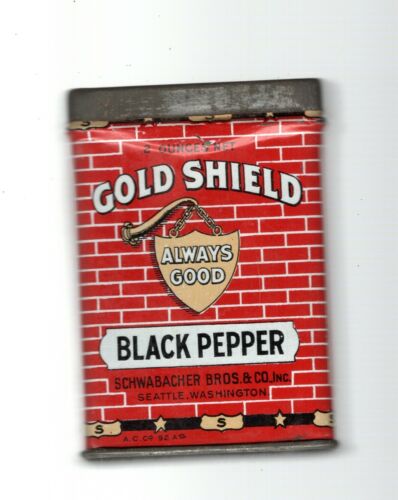 Title (ebay affiliate link): Vintage Gold Shield Black Pepper 2 oz spice tin Seattle Wa.