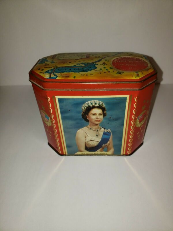 Title (ebay affiliate link): Queen Elizabeth II Vintage Gray Dunn Biscuit Tin St Lawrence Seaway Souvenir