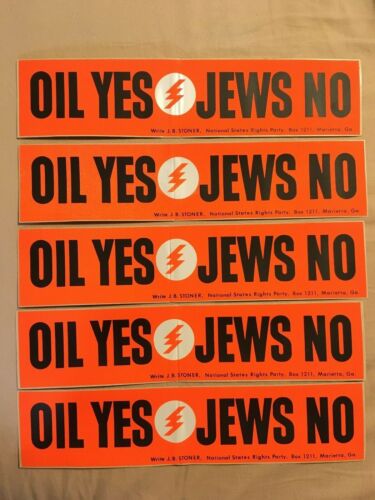Title (ebay affiliate link): 5 Vintage Bright Orange "Oil Yes, Jews No" Bumper Stickers