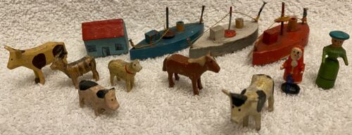 Vintage 12 Hand Carved Wood Wooden Miniature Santa Boats Animals Woman House