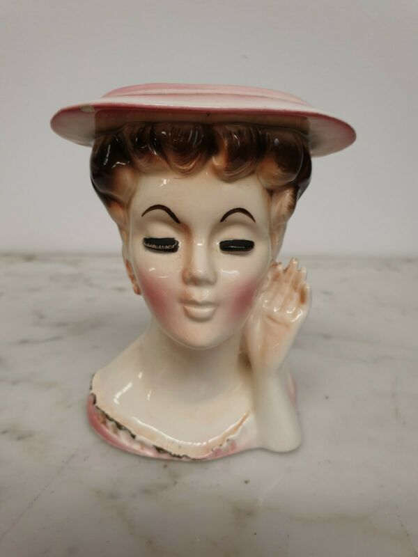 Vintage Lady In Pink Dress & Hat With Eyes Closed Head Vase AF