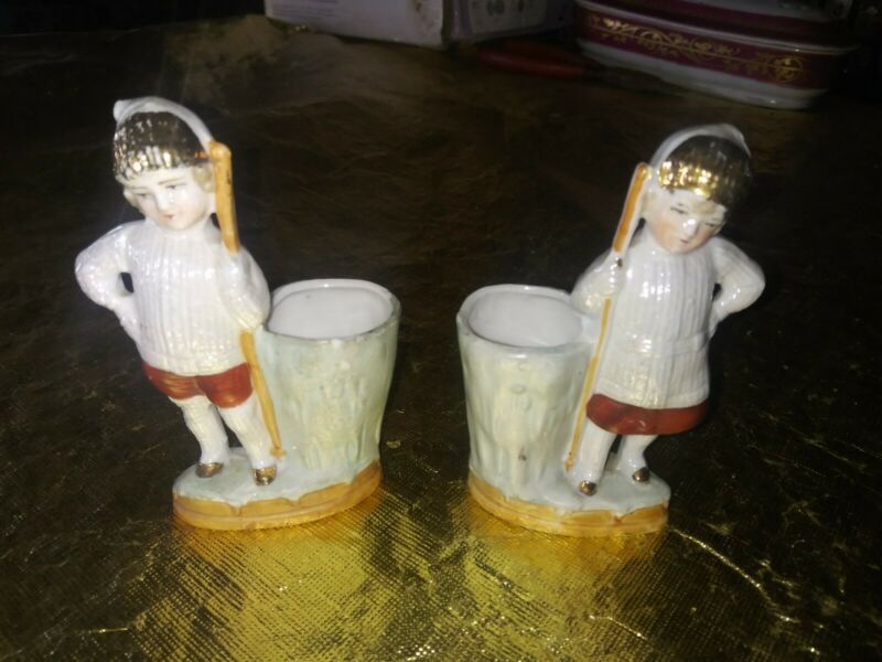 Antique.Victorian Match Holder Germany Porcelain Bisque 4" Set Boy Girl $10 off!
