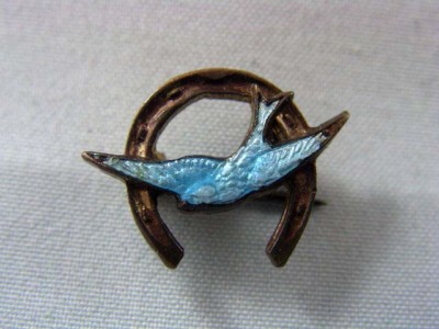 Title (ebay affiliate link): TINY Antique DOLL/BABY Enamel BIRD HORSESHOE PIN Brooch