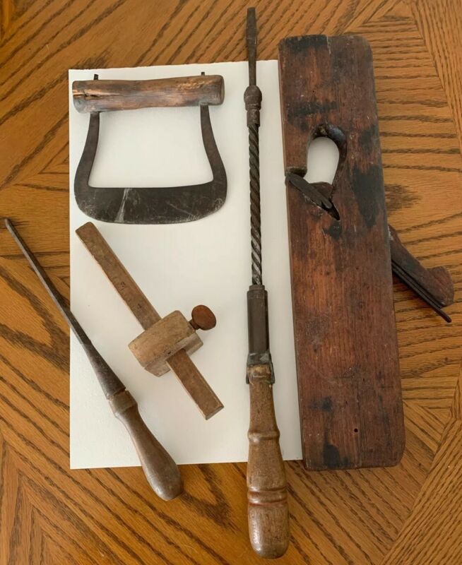 Title (ebay affiliate link): Nice Primitives Antique Tools Lot Plane Hand Drill Log Haul Adjustable Measure
