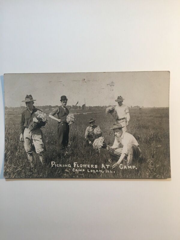 Title (ebay affiliate link): Antique Real Photo Postcard National Guardsman Picking Flowers, Camp Logan, IL.
