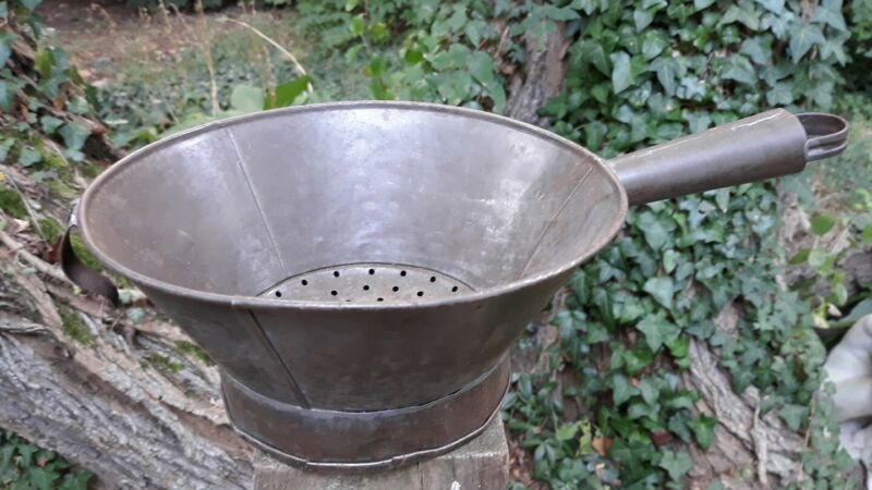 Title (ebay affiliate link): Antique Primitive Tin Strainer Colander Over Pot Hook Hollow Handle Farmhouse 9"