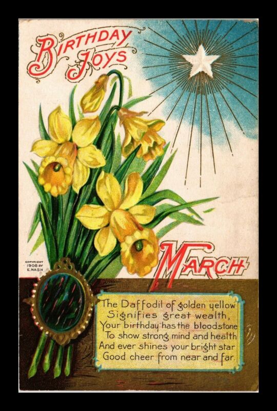 Title (ebay affiliate link): DR JIM STAMPS US MARCH BIRTHDAY JOYS EMBOSSED FLOWERS STAR POSTCARD