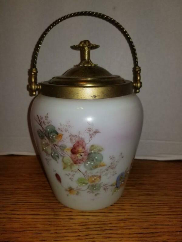 1800s Antique Victorian Milk Glass Biscuit Jar w/Hand Painted Flowers