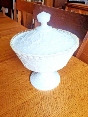 Title (ebay affiliate link): Vintage FENTON MILK GLASS Silver Crest Spanish Lace WEDDING COMPOTE Dish & Lid