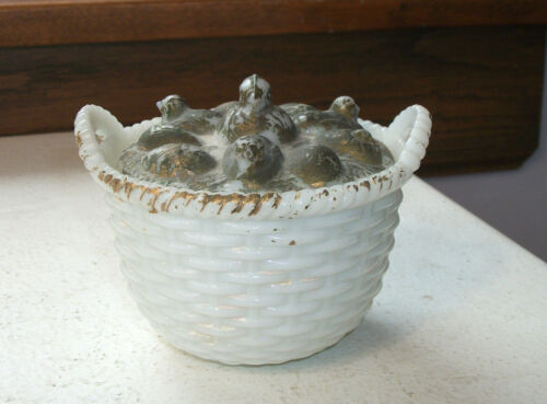 Title (ebay affiliate link): EAPG Milk Glass Covered Dish Small Chicks in a Basket w Orig Cold Paint ca 1890s
