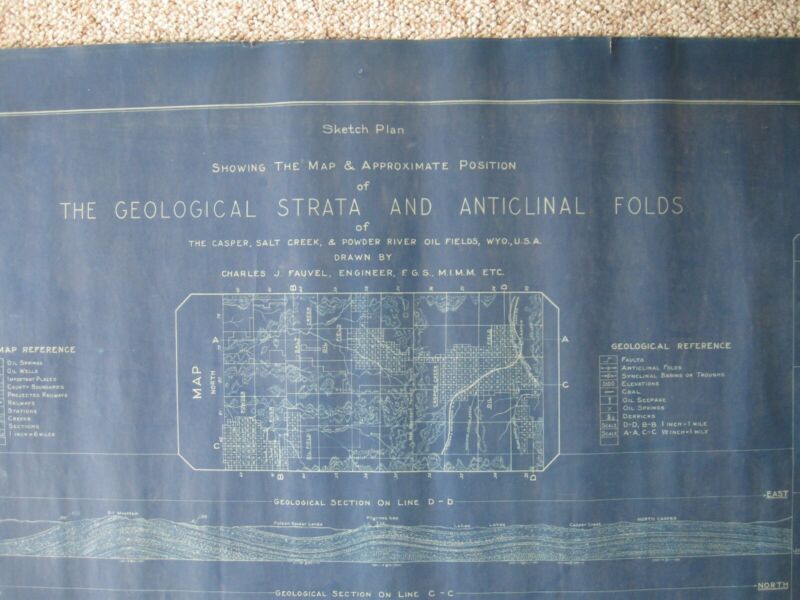 Title (ebay affiliate link): 1930s Casper Salt Creek & Powder River Oil Fields Wyoming Geologic Strata Map