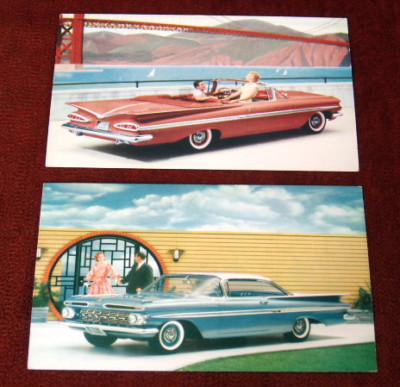 1959 CHEVROLET IMPALA POSTCARDS 2 DIFFERENT CARDS