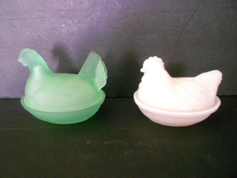Title (ebay affiliate link): VINTAGE 2 4" GLASS HENS ON NEST COVERED CANDY/TRINKET MILK GLASS & FROSTED GREEN