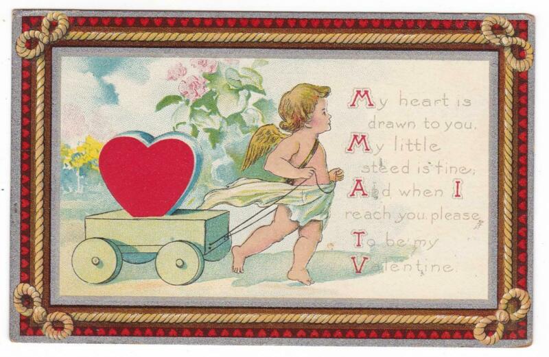 vintage Valentine postcard. My heart drawn to you. cupid wood wagon red heart