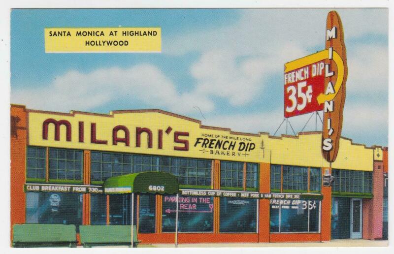 Title (ebay affiliate link): vintage postcard. Hollywood California. Milani''s french dip buffet bakery