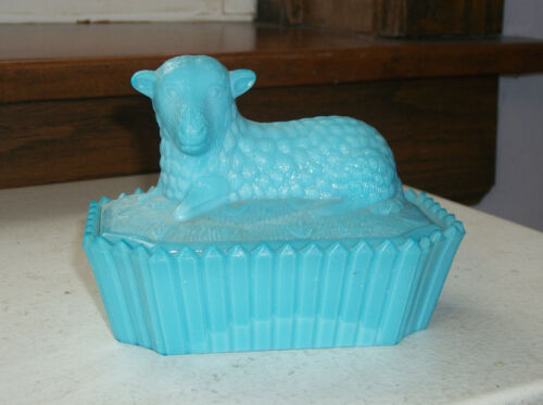 Title (ebay affiliate link): Blue Milk Glass Covered Dish Lamb Picket Fence #3 Westmoreland Exc Condition