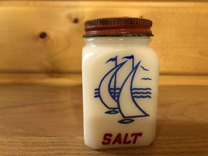 Title (ebay affiliate link): Vintage 1940s White Milk Glass Salt Shaker Red Top with Sail Boats