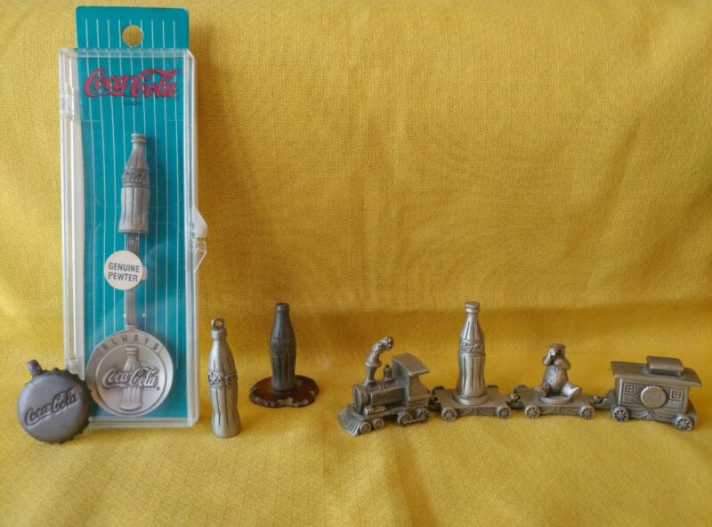 Vintage Lot Coca Cola Pewter. Train, Spoon. Cap & Bottle pendants.Bottle on rock
