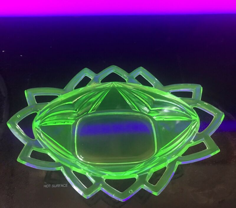 Indiana 1926-32 GREEN VASELINE DEPRESSION GLASS PICKLE BOWL DISH PYRAMID PATTERN