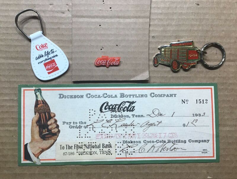 Title (ebay affiliate link): Vintage Coca Cola Collection of 1933 Bottling Co. Check, 2 Key Rings & Lapel Pin