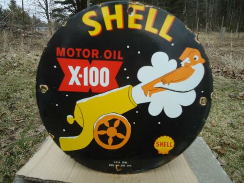 Title (ebay affiliate link): OLD VINTAGE 1951 SHELL MOTOR OIL X-100 PORCELAIN ADVERTISING SIGN