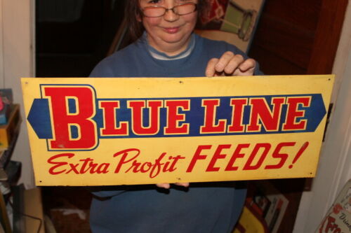 Vintage 1950''s Blue Line Feeds Cow Pig Chicken Feed 22" Metal Sign