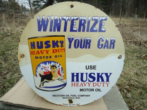 Title (ebay affiliate link): VINTAGE 1947 HUSKY HEAVY DUTY OIL PORCELAIN GAS STATION PUMP SIGN