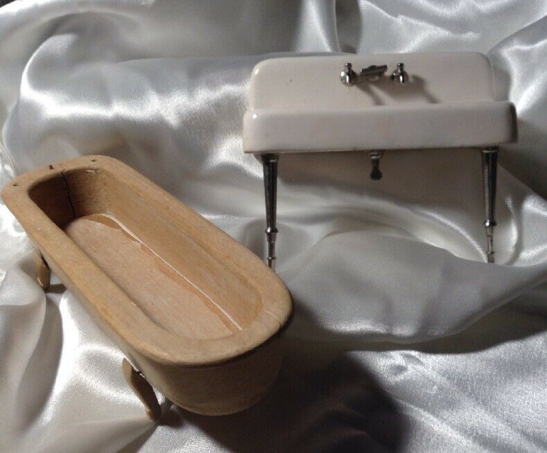 Title (ebay affiliate link): VINTAGE DOLLHOUSE BATHROOM FURNITURE PORCELAIN WALL SINK..ARTIST MADE WOOD TUB