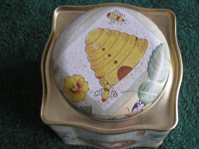 COLLECTABLE TIN, UNIQUE SHAPE, BIRD NEST, BEES, BUTTERF