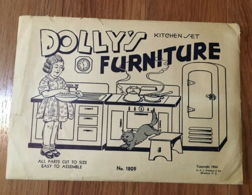 Title (ebay affiliate link): 1944 CARDBOARD "DOLLY''S KITCHEN SET FURNITURE" NO. 1809 BY A.J. WILDMAN & SON
