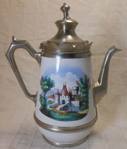 Title (ebay affiliate link): Good Antique Graniteware & Pewter Coffee Pot With Castle Scene, Very Clean