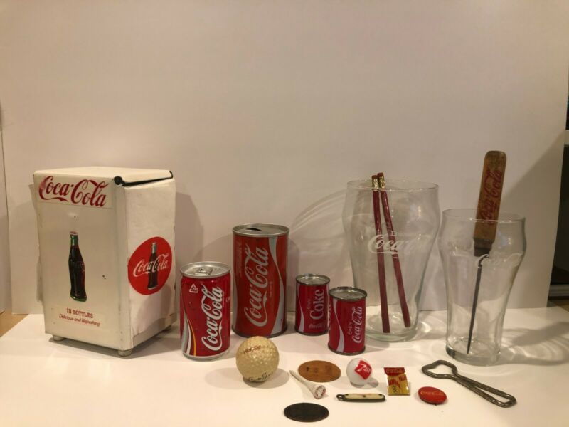 Title (ebay affiliate link): Lot of 18 Items Coke Coca Cola Cans, Glasses/Ice Pick, S&P Shakers, NapkinHolder