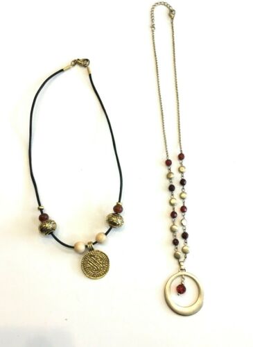 Lot of 2 Beaded Necklaces Bronze Tone Oval Bead Drop Gold Tone Medallion Boho