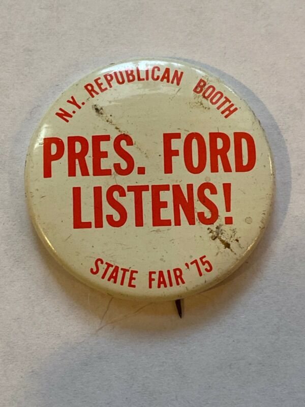 Title (ebay affiliate link): NY Republican Booth State Fair 1975 Pres Ford Listens Pinback