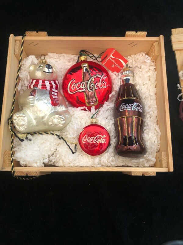 Kurt Adler Polonaise 4 Glass Coca Cola Coke Christmas Ornament Set in Wood Box