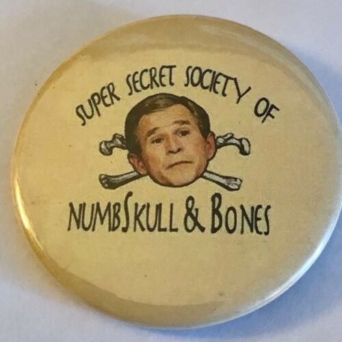 Title (ebay affiliate link): Humorous 2 1/4" GW Bush "Super Secret Society of NumbSkull and Bones" Pin