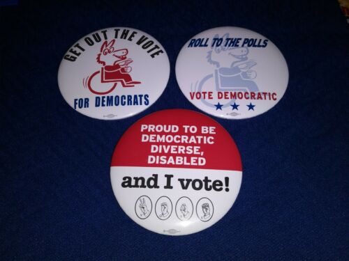 Title (ebay affiliate link): HEARING IMPAIRED GET OUT VOTE DIVERSITY DEMOCRAT SIGN LANGUAGE PINBACK BUTTONS