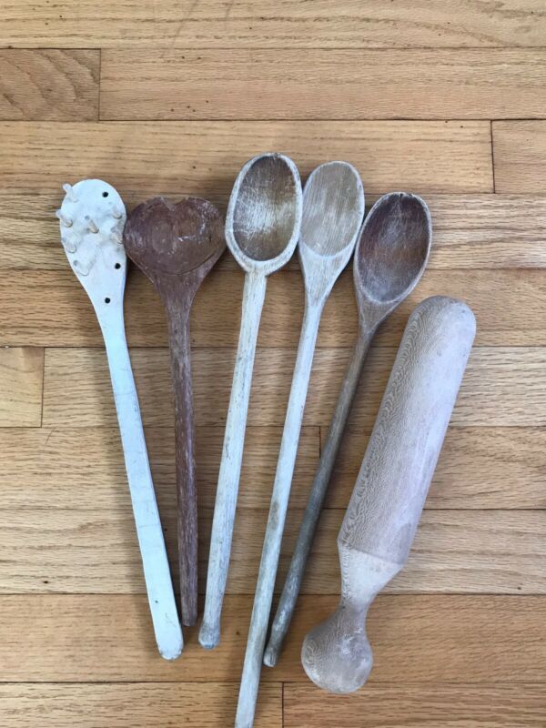 Title (ebay affiliate link): Lot of 6 Primitive Vintage Wooden Kitchen Utensils Spoons Pestle Etc.