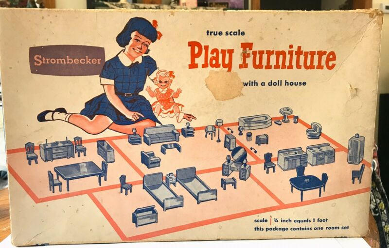 Title (ebay affiliate link): VINTAGE STROMBECKER WOOD DOLLHOUSE FURNITURE THREE ROOM BEDROOM BATHROOM DINING