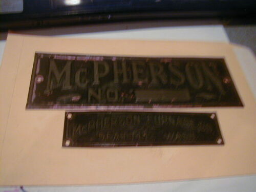 2 RARE OLD BRASS PLAQUES McPHERSON FURNACE CO. SEATTLE WASH GOOD USED CONDITION