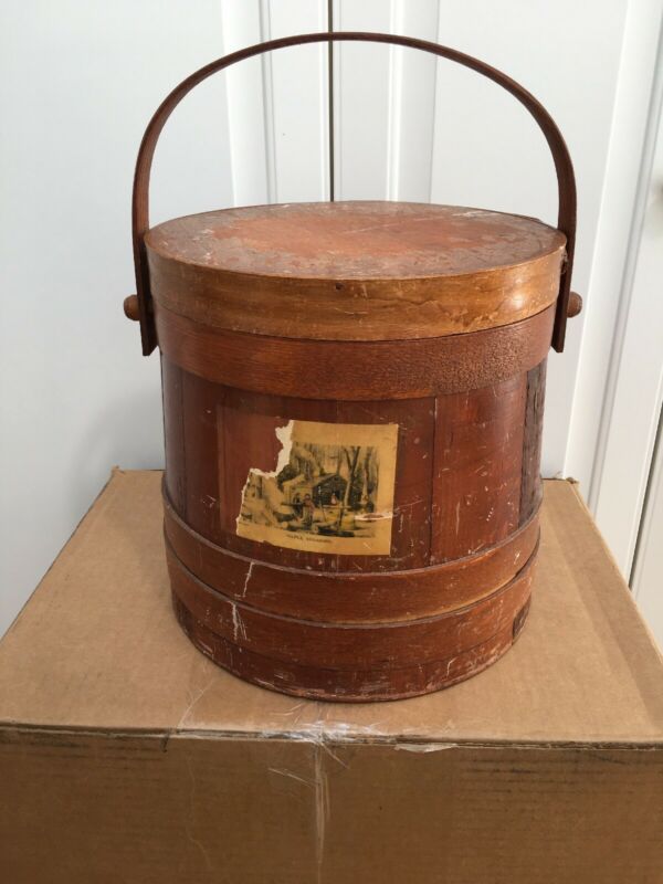 Title (ebay affiliate link): Vtg Wooden Firkin Bucket Sewing Box Primitive Shaker Style Banded Sugar Bucket