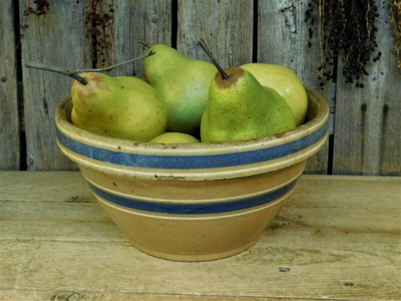 Title (ebay affiliate link): Antique Primitive Blue Banded Yellow Ware Bowl with Pears