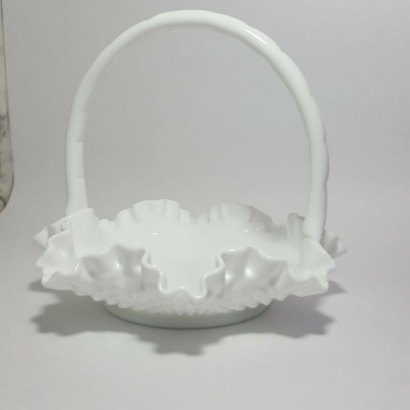 Vintage Fenton Basket Hobnail Milk Glass Ruffled Handle Basket Candy Dish Easter