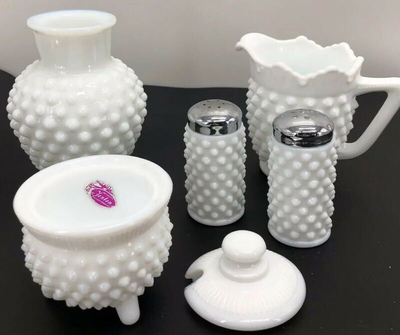Lot Of White Milk Glass Fenton Hobnail Vase Salt Pepper Sugar With Lid & Creamer